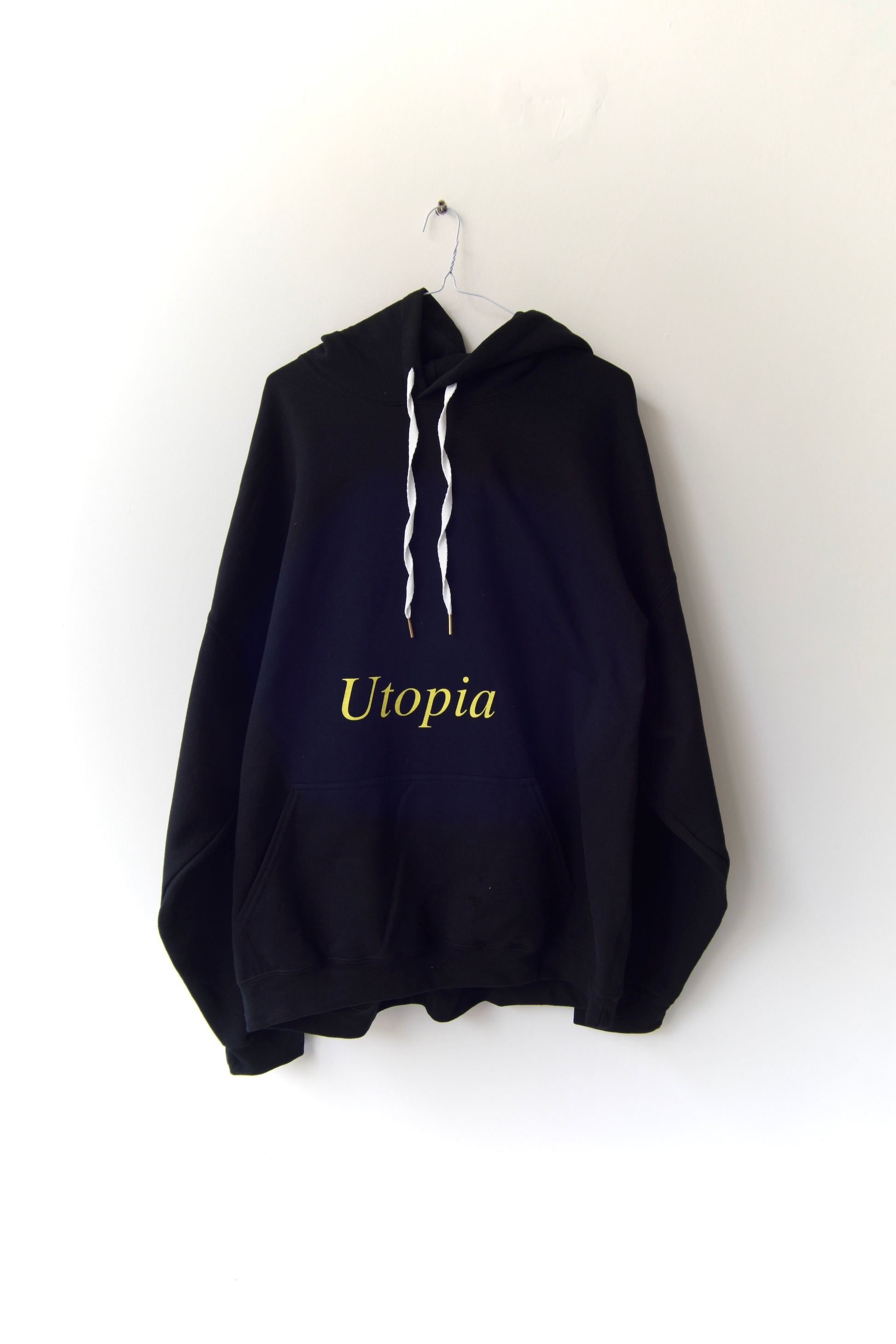 Black Utopia Hoodie featuring front and back print, white shoelace drawstring, and metal aglet tips.